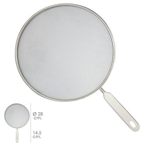 Tapa antisalpicaduras - Medida: ø 28 cm. - Medida mango: 14,5 cm. largo x 2.5 ancho - Malla realizada en aluminio que permite que salga el vapor pero evita las salpicaduras. - Mango de sujección realizado en plastico. - Diseño plano que facilita su almacenaje en cualquier lugar. - Articulo conocido como tapa anti salpicaduras aceite, tapa anti salpicaduras olla, tapa anti salpicaduras freir, tapa anti salpicaduras fritos.