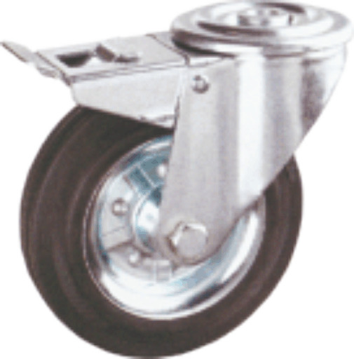 RUEDA CON SOPORTE EN ACERO ESTAMPADO DESDE 2,5 HASTA 4mm. de espesor. Rodamiento de doble hilera de bola, sobre pista cementada. Acabdo zincado brillante. Aro con nucleo metalico, banada de goma negra y cojinete a rodillo