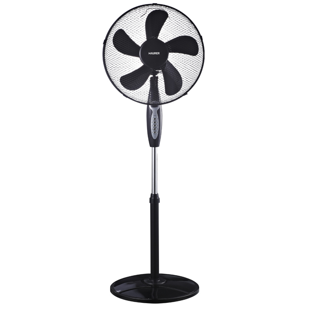 Ventilador de pie - Potencia: 45 w. - Cuenta con 5 palas de gran tamaño. - Con control remoto. - Base de Ø 40 cm con contrapeso. - 3 velocidades. - Diámetro 40 cm. - Con temporizador de hasta 7,5 horas. - Función oscilante automatica. - Inclinación ajustable. - Longitud del cable: 1,5 metros.